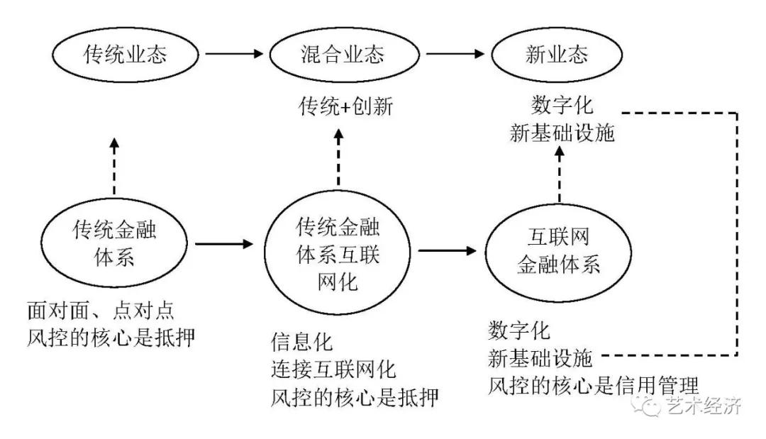 在传统业态中,基于金融体系的服务一开始是面对面、点对点的,风控体系的核心是抵押或质押。随着混合业态的出现,金融服务随着科技融合的发展,金融科技的业态也在发生变化,把传统的金融体系互联网化,其核心是基于信息化基础上的基础设施建设,最突出的表现是服务等手段发生了变化,但服务的风控体系的核心仍没有改变,核心仍然是抵押和质押。现在所谓的很多互联网金融的业务,其风控体系的核心仍然是抵押(质押),并没有真正实现基于数字化基础上的新的基础设施的建构,也就是说,没有实现风控体系核心的转型。正如马云先生在前几天发言中所说,当下的p2p不是互联网金融,我们的金融服务还处在当铺阶段,讲的就是这个道理。虽然金融业态互联网化了,但是仍然是基于传统业态的互联网化,没有实现新的业态转型,当然这需要有一个过程。
