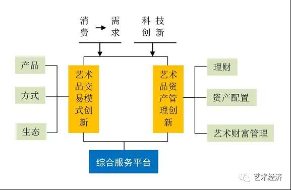 科技融合发展驱动艺术金融发展的战略方向突出地表现在两个方面:一是基于综合服务平台的交易模式的创新;二是艺术品资产管理创新。具体见下图: